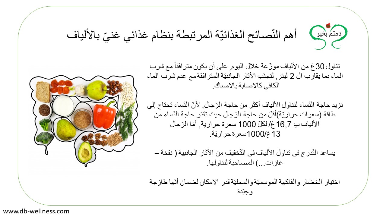 | تناول 30غ من الألياف موزّعة خلال اليوم, على أن يكون مترافقاً مع شرب الماء بما يقارب ال 2 ليتر, لتجنّب الآثار الجانبيّة المترافقة مع عدم شرب الماء الكافي كالاصابة بالامساك |